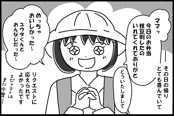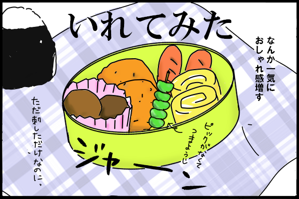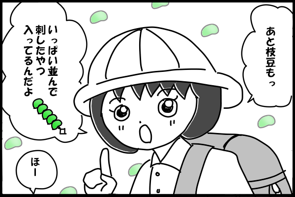 2022年04月24日 お弁当の主役 冷凍枝豆並べて刺しただけで、サンちゃんにとってのメインおかず級になったようです。冷凍枝豆常備しててよかった。春休みのお弁当は3日間だけでしたが、保育園の時は年1、2回しかなかったので連続3日作るだけでも大変でした。毎日作ってる方尊敬。お弁当はおかず作ることより詰めるのが苦手なので(センスの問題?)、次なる夏休みに向けて、隙間埋めおかずのレパートリーを増やしておこうと思います。それではー。ブログランキング参加してみました。GW前最終週だ!! 人気ブログランキング 「サンちゃんの話」カテゴリの最新記事 < 前の記事次の記事 > コメント コメントフォーム 名前 コメント 記事の評価 リセット リセット 顔 星 情報を記憶 コメントを投稿する