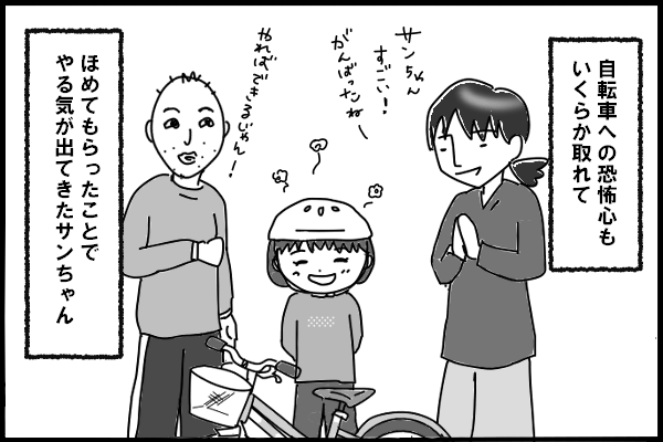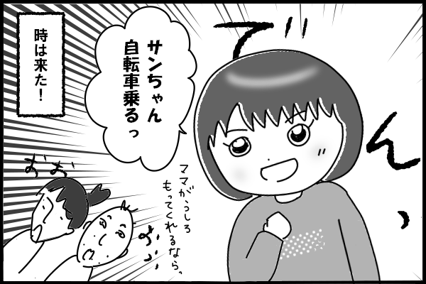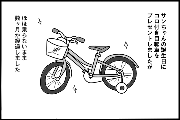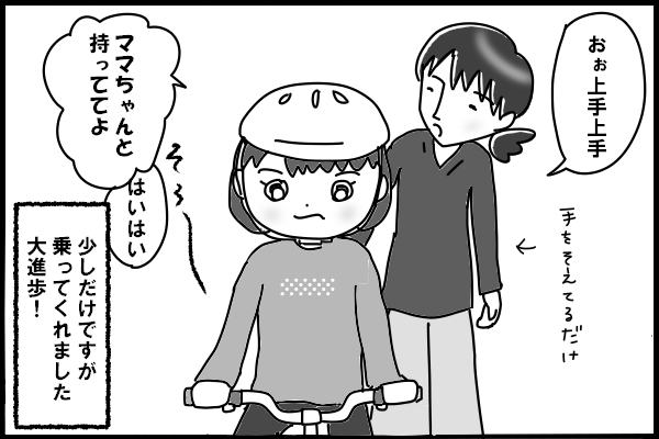 2、3回、サドルの後ろを支えてダッシュして、スピードに乗ったら手を離すっていうのをやってたら、そのまま結構な距離走ってて…。