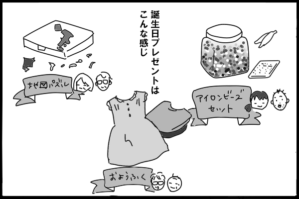 旦那の両親から洋服系をもらって、私の両親から知育系グッズをもらうのが定番になりつつあります。
